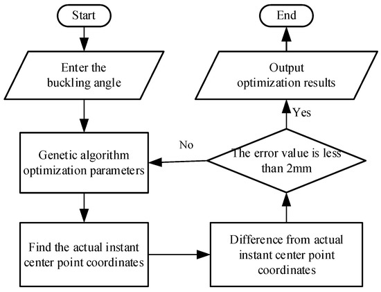 We use genetic algorithms for optimization. Not only can we get numerical results quickly, but the accuracy will also get higher and higher. The knee joint prosthetic six-bar mechanism has a total of 10 basic parameters and an initial angle . According to the vector equation, the coordinates of the end points of each rod can be obtained, and then the instantaneous center coordinates of the thigh and shank are obtained according to the three-center theorem. The driving angle is selected as the thigh flexion angle, that is, an instant center coordinate is obtained for every 10 degrees of rotation. The optimization process is shown in Figure 11.
