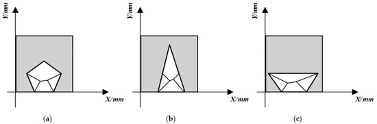 Restricted area of the six-bar mechanism. (a) Normal position, (b) Y-direction limit position, (c) X-direction limit position.