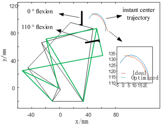 In order to further explain the optimization effect, the initial and final states of flexion of the 6-bar knee prosthesis are compared as shown in Figure 13. The figure shows the initial state of the mechanism (0° flexion) and the final state (110° flexion), and the optimized instant center trajectory and ideal instant center trajectory. From the figure, it can also be more intuitively found that the instantaneous center of motion of the thighs and lower legs in the knee joint prosthesis of the optimized 6-bar mechanism is closer to the ideal instant center, indicating that the mechanism has good bionics. And the flexion range of 0° to 110° not only meets the normal walking needs of the lower limb disabled people, but also can achieve large flexion angles such as going up and down stairs and squatting.