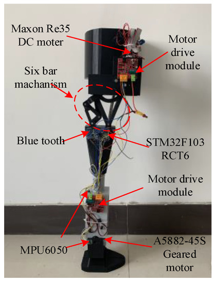 Obtain the structure optimization results of the knee joint, and design the prosthesis experimental prototype, as shown in Figure 14. In order to achieve tracking control of the knee and ankle joint angle in different working modes, first set different tasks in the microcontroller. The modes (walking, up and down stairs, and up and down slopes) correspond to the time-varying expressions of the joint angle. During work, the deviation of the expected joint angle from the actual joint angle is calculated according to the cycle time, and the two motor drive signals required by the PID control pattern are calculated. The DC motor is driven to rotate by two PWM signals, so that the knee and ankle joints can track the expected pattern of motion, and finally the data is transmitted to the PC by the Bluetooth module.