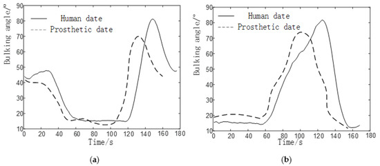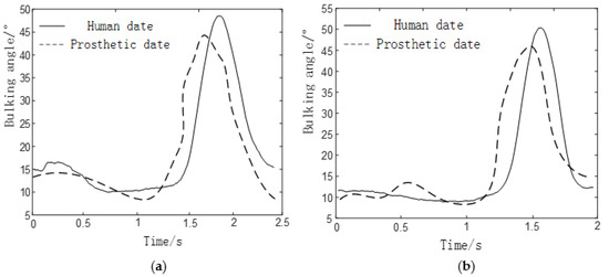 Comparison of knee prosthesis data and human data. (a) Knee joint angle change on the upstairs. (b) Knee joint angle change on the downstairs.
