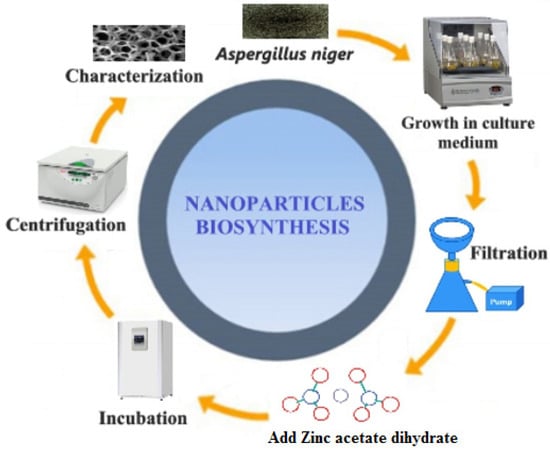 Green production of metal-oxide NPs utilizing biomass constituents is appealing because these methods are uncomplicated, cheap, and non-toxic compared to chemico-physical procedures [38,39,40,41]. The current study reports the extracellular synthesis of A/ZnO-NPs via fungi. The biochemical procedure of NP shaping and stabilization has remained largely undiscovered, except for some investigation groups that have shown that the proteins observed in enzymes released by microorganisms are the chief biomolecules included in the formation of metal/metal oxide NPs. Figure 1 summarizes the mechanism of synthesis of ZnO-NPs by A. niger.