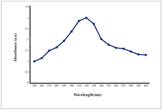 UV–Vis spectrum analysis is usually used to study the size and shape of NPs [42]. The rate and width of the surface plasmon absorbent rely on the size/shape of the NPs as well as on the dielectric constant of the metal itself and the surrounding medium. It is also well known that solutions containing ZnO-NPs exhibit a characteristic absorption peak below 400 nm. Therefore, the A/ZnO-NPs absorbance peak was identified using UV–Vis spectroscopy in the range of 250 to 400 nm. The UV–Vis spectrum analysis of the biosynthesized A/ZnO-NP specimen is displayed in Figure 2. It was revealed that the UV–Vis absorption spectra of green synthesized ZnO-NPs showed an absorption peak at 320 nm. The bandgap energy was calculated using the formula Eg = 1240/λ eV and was found to be 3.8 eV, which is comparable to the previously reported values of energy bandgap for ZnO nanoparticles [43,44]. It is worth noting that the obtained Eg value was different from the bandgap of bulk ZnO (3.37 eV); this result can be attributed to the optical confinement effect corresponding to the size and length of NPs [45].