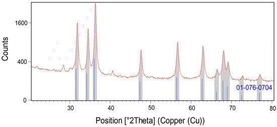 Powder X-ray diffraction (PXRD) was conducted to examine the crystal structure of the optimized sample and crystallite size (Figure 3). The crystal structure was compatible with the reference pattern of zinc oxide with code JCPDS #01-076-0704. Hence, the corresponding (hkl) values were (100), (002), (101), (102), (110), (103), (200), (112), (201), (004), and (202). The calculated 20 values and intensities (%) were 31.74 (57), 34.38 (41.5), 36.22 (100), 47.48 (21.2), 56.54 (30.8), 62.78 (26.5), 66.30 (4.1), 67.87 (22), 69.01 (10.9), 72.47 (1.6), and 76.87 (3.4). The 2θ values of the synthesized A/ZnO-NPs were in close relation to the reference pattern, which had values of 31.90, 34.55, 36.35, 47.58, 56.62, 62.92, 66.44, 68.00, 69.18, 72.73, and 77.08°. The A/ZnO-NPs had a hexagonal crystal system and P63mc space group. The crystallite size of the nanoparticles was obtained by the Scherrer equation, which was calculated to be 35.51 nm.
