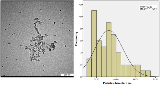 TEM image of the biosynthesized A/ZnO-NPs and its histogram of particle diameter.