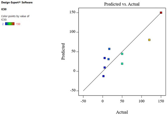 Therefore, A² and B² were the significant model terms with F-values of 16.98 and 47.60 (Table 2). Hoseinpour also reported that extract ratio was a significant factor for the biosynthesis of ZnO-NPs from a Dittrichia aqueous extract [54]. Figure 6 displays the predicted response values in parallel to the actual response values. The purpose was to identify a value or group of values not easily predictable by the model.