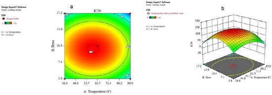The combined result of the dose and temperature was evaluated and the consequences were given in the form of contours and 3D plots (Figure 7a,b). The contour plot against IC50 for temperature and dose is shown in Figure 8a. Contour plots are a way to show a three-dimensional surface on a two-dimensional plane (Figure 7b). The 3D surface plot is a projection of the contour plot giving shape, in addition to the color and contour. Figure 8a,b shows that if the temperature increases from 36 to 89 °C and the dose increases from 3.8 to 17, the IC50 on the MCF-7 cells decreased from 150 to about 50, which means that it is in accordance with the model.