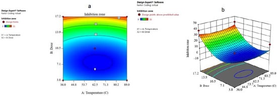 The combined result of the dose and temperature was examined and the results are given in the form of contours and 3D plots (Figure 7a,b). The contour plot against inhibition zone for temperature and dose showed that if the dose increases from 3.8 to 17.2, the inhibition zone increases up to 35 mm, which means that it is in accordance with the model.