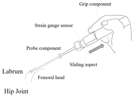 Ten patients, including five men and five women, undergoing hip arthroscopic treatment for symptomatic cam-type FAI lesions participated in this study. The mean age (and standard deviation (SD)) was 41.5 ± 3 years in the age range of 23–60 years. All of the patients gave informed consent, and the study was ethically approved by institutional review board (please see Institutional Review Board Statement and Informed Consent Statement ) in the hospitals. Three surgeons from the list of authors performed the surgeries in the supine position on a traction table under general anesthesia with a well-padded peroneal post. An anterolateral portal was established under fluoroscopy, then mid [,] or modified anterior [] portals were established manually, and an inter-portal capsular cut was performed to improve their accessibility. Using a normal metallic probe, we confirmed the presence of a partial labral tear (i.e., imperfect detachment of acetabular rim from the bone) at the anterosuperior portion in all ten cases. Then, the measurements were taken using the probing device [].