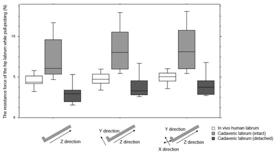 Similar quantitative measurements of soft tissues while probing were made in two previous reports [,]. One of them [] investigated the resistance force of meniscus tissue at pull-probing. Ten menisci were acquired from freshly frozen cadaveric knees and then mounted on a mechanical platform to monitor the force parameters. The maximum probing force was up to 8.5 N. In addition, the authors assumed that the cadaver tissue might be stiffer than living tissue, while the tissue from elderly people was not stiff as young and healthy people. Unfortunately, a direct comparison was not performed. Another paper [] addressed a probing device equipped with a force and torque sensor. Several tests during knee arthroscopy, including pull-probing of the meniscus tissue, were performed in two surgical patients in the manuscript. However, there were no pull-probing force data reported, and a comparison between living and cadaver tissues was not made. To the best of our knowledge, a comparison between in vivo and cadaveric hip labrums has not been reported.