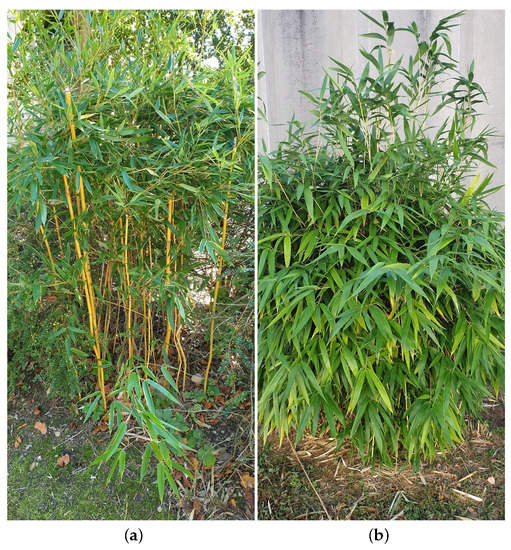 Photographs of the bamboo varieties studied: (a) Phyllostachys Aureosulcata, (b) Sasa Palmata.