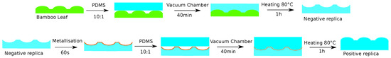 To obtain the positive replica, the same protocol is used with the negative replica previously made as the original surface. However, to limit PDMS/PDMS adhesion, a coating of a few nanometers of gold is made with a vacuum sputtering metallizer. This step is traditionally carried out with a fluorine treatment [39,43]. However, fluorine treatments have strong impacts on superhydrophobic properties. Therefore, in order to limit the contamination of positive replicas, gold metallization is preferred to fluorine treatment. Once this step is complete, it is possible to reproduce the previous steps to obtain a positive replica of the original natural surface.