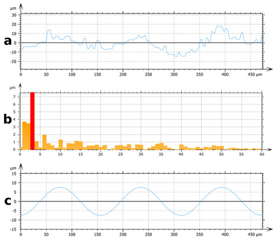 Figure 3. Example of frequency filtering by FFT: (a) unprocessed profile of Phyllostachys Bamboo leaf, (b) frequency spectrum with in red the selected frequency, and (c) filtered profile. - The second filtering process involves Gaussian filters [30]. Gaussian filters are configured by a cut-off wavelength . By applying a Gaussian filter to a surface, two surfaces are obtained (Figure 4). The first one contains the wavelengths lower than the cut-off value (Figure 4b). The second one contains the wavelengths higher than the cut-off value (Figure 4c). For a wavelength equal to the cut-off value, 50% of its amplitude is transmitted to each of the surfaces produced by filtering. Due to this property of Gaussian filters, it is necessary to choose a cut-off wavelength far away from the wavelengths of the scales to be separated. The choice of the cut-off value for each surface studied is based on SEM observation. This method is used to separate the scales of large period versus small period profiles.