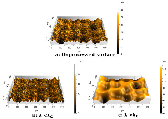 Figure 4. Example of Gaussian filtering, with a cut-off of 120 μm, on Phyllostachys bamboo leaf: (a) unprocessed surface, (b) filtered surface for small scales, and (c) filtered surface for high scales.