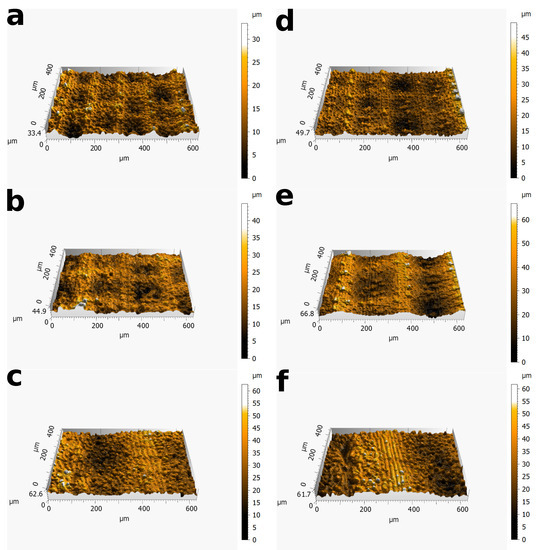 The characterization of the morphology by SEM was completed using a quantitative analysis based on optical inteferometric measurements. These measurements were carried out in VSI mode (Vertical Scanning Interferometry), with green light (515 nm wavelength). The analyses of interferometric measurements were performed with the MountainsMap software (DigitalSurf) using the ISO-25178 roughness standard [44].