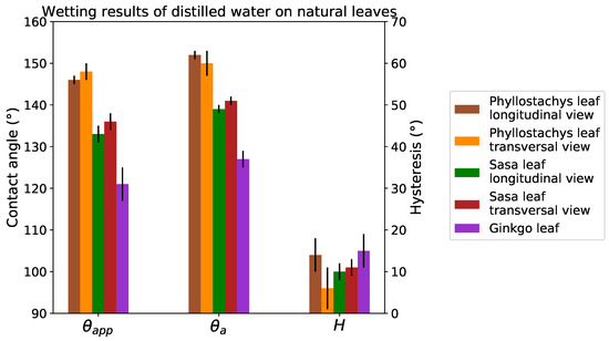 The wetting experiments carried out on plant surfaces show a high hydrophobicity of these surfaces (Figure 9). Both species of bamboo present static contact angles greater than 130. The contact angle even reaches 145 in the case of the Phyllostachys species. On the Ginkgo leaf, the contact angle is 120. This result differs from the experiments carried out by Neinhuis and Barthlott [20], who measured an angle of 160. This difference can be explained by a longer time between the harvesting of the leaf and the wetting experiments. From the point of view of the wetting dynamics, the hysteresis of these plants is always less than 15. These low hysteresis values demonstrate the non-adhesive properties of these plants and their strong abilities for water repellency.