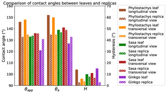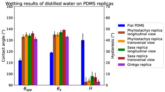 The contact angles on the replicas compared to the flat PDMS indicate a very high texture contribution to the hydrophobicity of these surfaces (Figure 10). The static contact angle on the replicas is 20 greater than on the flat PDMS. In addition, the 40 for the hysteresis on flat PDMS is lowered to 10 on the replicas. Due to the anisotropic nature of bamboo topographies, contact angles are measured in two directions on natural leaves and on the replicas. Despite this strong topographical anisotropy, a tiny anisotropy in wetting properties is observed.