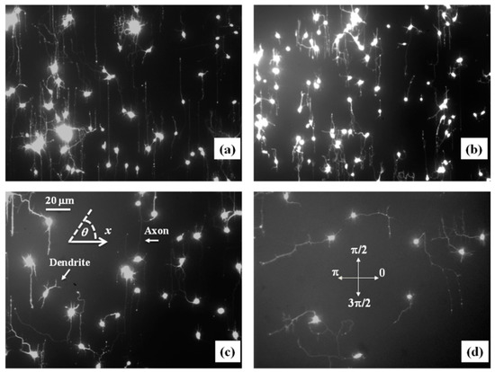 Figure 2a,b show examples of images of axonal growth for untreated neurons cultured on PDL-coated PDMS micropatterned surfaces with pattern spatial period: d = 3 (Figure 2a), and d = 5 μm (Figure 2b). We have previously demonstrated that axons of untreated neurons display maximum alignment along PDMS patterns for surfaces where the pattern spatial period d matches the linear dimension of the growth cone l, where l is in the range 2 to 6 μm [20]. The experimental data shown in Figure 2a,b is in agreement with our previous findings. Examples of the corresponding axonal normalized angular distributions are shown, respectively, in Figure 3a,b.