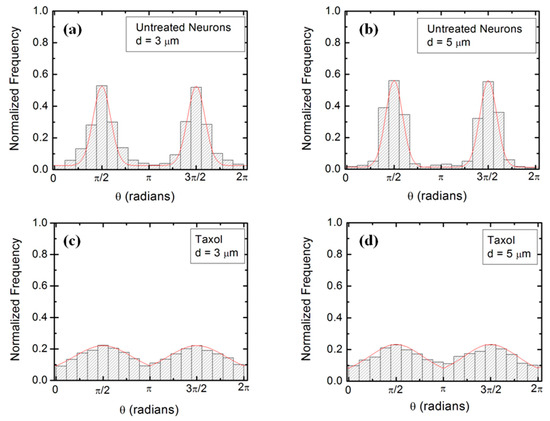 Examples of normalized experimental angular distributions for axonal growth for neurons cultured on micropatterned PDMS surfaces with different pattern spatial periods d. The vertical axis (labeled normalized frequency) represents the ratio between the number of axonal segments growing in a given direction and the total number, N, of axon segments. Each axonal segment is 20 μm in length (see Section 2 on Data Analysis). All distributions show data collected at t = 36 h after neuron plating. The continuous red curves in each figure are the predictions of the theoretical model discussed in Section 4. (a) Angular distribution obtained for n = 1240 different axon segments (350 axons) for untreated neurons cultured on surfaces with d = 3 μm (corresponding to Figure 2a). (b) Angular distribution obtained for n = 1158 (324 axons) different axon segments for untreated neurons cultured on surfaces with d = 5 μm (corresponding to Figure 2b). The data shows that the axons display strong directional alignment along the surface patterns (peaks at ), with a high degree of alignment given by the sharpness of the distributions. (c) Angular distribution obtained for n = 1093 different axon segments for neurons treated with Taxol and cultured on surfaces with d = 3 μm (corresponding to Figure 2c). (d) Angular distribution obtained for n = 845 different axon segments for neurons treated with Taxol and cultured on surfaces with d = 5 μm (corresponding to Figure 2d). The neurons treated with Taxol show a significant decrease in the degree of alignment with the surface patterns compared to the untreated cells.