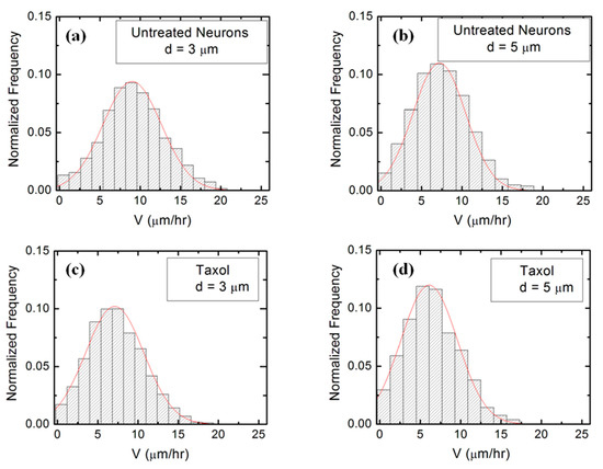 Examples of normalized speed distributions for growth cones measured on micropatterned PDMS surfaces with different pattern spatial period d. All distributions show data collected at t = 36 h after neuron plating. The continuous red curves in each figure are data fits with the theoretical model discussed in Section 4. (a) Speed distribution for n = 452 different growth cones measured for untreated neurons cultured on surfaces with d = 3 μm. (b) Speed distribution for n = 488 different growth cones measured for untreated neurons cultured on surfaces with d = 5 μm. (c) Speed distribution for n = 416 different growth cones measured for Taxol treated neurons cultured on surfaces with d = 3 μm. (d) Speed distribution for n = 395 different growth cones measured for Taxol treated neurons cultured on surfaces with d = 5 μm.