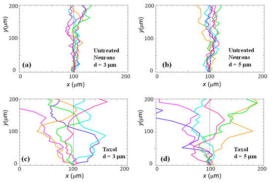 Examples of simulated neuronal growth for: untreated (a,b); and Taxol-treated (c,d) neurons. The simulations are performed using the values of the growth parameters obtained from the fit of the experimental data with Equations (2) and (4) (see main text). The pattern spatial periods correspond to the data shown in Figure 3 and Figure 4: d = 3 μm for (a,c), and d = 5 μm for (b,d).