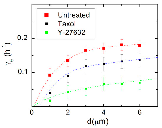 To further investigate the automatic controller model, we measure the variation of the deterministic torque () (control parameter) with the pattern spatial period (d) (external stimulus). Figure 6 shows the variation of the experimentally measured values for with d, for untreated neurons (red squares), as well as for neurons treated with Taxol (black squares) and Y-27632 (green squares). As shown in references [43,44,45] on work performed for galvanotaxis and chemotaxis dose-response curves for the motion of human granulocytes and keratinocytes, the automatic controller model leads to the following dependence for the variation of the control parameter with the external stimulus: