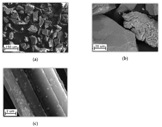 Ni(OH)2/CS obtained by crushing and subsequent sieving of fractions with a given particle size have an irregular shape. The particles have a dense structure. In the particles deposited on the surface of the carbon fiber, a layered structure is observed (Figure 1).