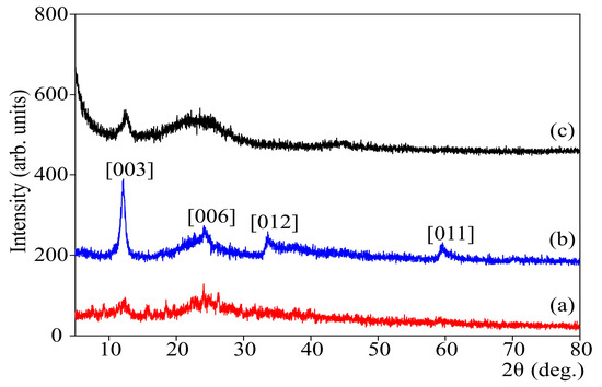 X-ray diffraction patterns of different samples Ni(OH)2/CS: (a,b) were obtained in different experiments; (c) was obtained in the presence of ACF as a substrate simultaneously with (b).