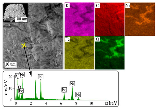 SEM-EDX analysis of the composite CS/FOC K-Ni; X-ray spectrum and distribution of elements K, C, Fe, O, and Ni.