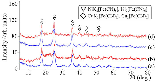 As observed from the XRD data (Figure 4), the use of chitosan had no effect on the structural characteristics of ferrocyanides. The X-ray images correspond to those of pure FOC powders and materials formed ex situ with the introduction of preliminarily obtained particles to the polymer [45,46].