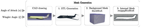The aircraft shape (i.e., including angle of attack and winglet deflection angle) was designated using a triangulated file (STL) from the CAD model (Figure 1). The blockMesh utility was used to design the “background mesh”, which is a domain of 44 m × 44 m × 70 m composed of hexahedral cells of 1 m3 (1 × 1 × 1 m). Then, the snappyHexMesh (SHM) tool was used to produce the aircraft integration (i.e., the aircraft shape defined using the STL file) in the “background mesh”. In order to perfectly smooth the wall of the plane, SHM use an algorithm that made refinement, smoothing, and re-alignment treatments using several techniques, such as chimera technics and curvilinear mesh [53,54]. The SHM algorithm performs mesh re-arrangement until the mesh quality criteria have been reached. In this study, the maximum non-orthogonality was set to 65, and the maximum skewness was set to 5. The refinement near wall was set using three layers measuring a maximum of 8.5 mm in total. The first layer, the closest to the wall, did not exceed 1.55 mm.