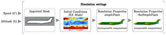 As meshes were designed as coarse as possible, while keeping an acceptable quality level due to computer resources limitations, it was necessary to take these aspects into account for the simulations steps. Indeed, with the “medium” mesh designed, it was difficult to reach a good rate of convergence using a compressible solver (such as rhoSimpleFoam, for instance). In order to avoid this problem, a special process was developed for the CRJ700 aerodynamic model. It consists of using two successive OpenFoam solvers, as illustrated in Figure 3. We observed that instability in solutions has been avoided during design and validation studies of the aerodynamic model [53].