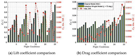 It is important to clarify that it is normal that the two models do not overlap, as it is not exactly the same aircraft being considered (one has the original Bombardier CRJ700 winglet, in “blue” color, and the other has an adaptive winglet with a pod, arranged at 73 deg, in “green” color). It can be observed in Figure 6a,b that there is a “gap” of error between the aerodynamic characteristics of the two models which reflects the impact of the pod integration.