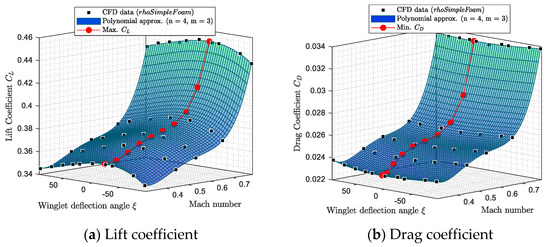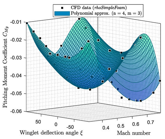 For the three longitudinal aerodynamic coefficients, the fitting surfaces with the closest R2 to 1 (R2 > 0.96) were polynomial surfaces corresponding to a fourth order for the Mach number inputs and to a third order for the winglet deflection angle inputs. As a reminder, R is the correlation factor usually used in identification methods, such as linear regression [56].