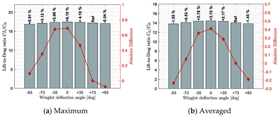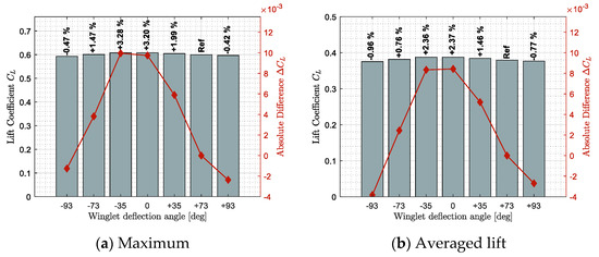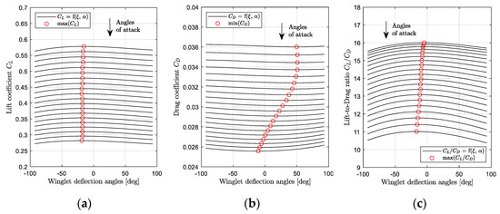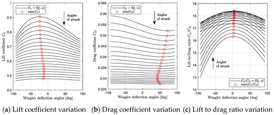 From Figure 19a, it was observed that the winglet angle needed to remain close to −15 degrees during the flight in order to obtain the maximum lift coefficient. However, it needed to change from −10 deg. to 50 deg. in order to offer the minimum drag coefficient along the flight (Figure 19b). Finally, to optimize the lift-to-drag ratio of the aircraft, the winglet deflection angles needed to change from −16 to −4 degrees (Figure 19c).