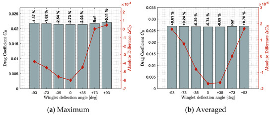 Figure 17a shows that using an adaptive winglet, the drag coefficient could be reduced by up to 0.0015. In 95% of cases, the drag coefficient has been reduced by 0.00038 ± 0.00031, which corresponds to a reduction of 1.30 ± 0.89% using relative values. Moreover, Figure 17b shows that the adaptive winglet allows the drag to be reduced by up to 2.90% for several flight conditions. These encouraging results confirm that using an adaptive winglet allows the drag generated to be reduced, and therefore, it improves aerodynamic characteristics of the aircraft. As a result, a fuel burn reduction is also expected for future performance studies.