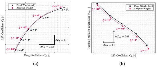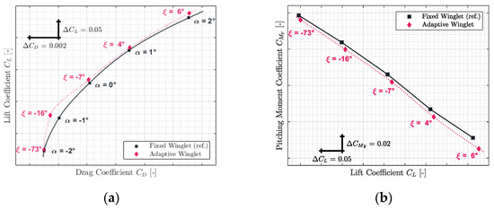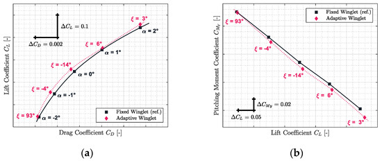 From the stability point of view, original aircraft properties could be conserved. Indeed, since the slope of the pitching moment versus the lift coefficient for an adaptive winglet is similar to that of the reference, the aircraft’s neutral point of stability (aft center of gravity) has been conserved. The only difference that could be noted concerns the fact that at origin () has changed, which could affect the aircraft trim status; for instance, the trimmed angle of attack should be lower for the adaptive than for the reference configuration. There is a high probability (because the difference is small) that the difference can be completely “corrected” by the trim operation or it would slightly increase the flight speed.
