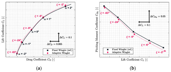 Practically, the same observations made for Mach number 0.31 could be made for the other flight conditions evaluated for Mach numbers 0.45, 0.54, 0.66, and 0.79. Indeed, it could be observed that in Figure 13a, Figure 14a, Figure 15a and Figure 16a, the aerodynamic polar corresponding to the aircraft equipped with an adaptive winglet (in “pink” color) is located on the left-top hand side of the reference aerodynamic polar. Moreover, these aerodynamic polars were obtained with a winglet deflection angle that is almost located within the range = −25 deg to = 10 deg.