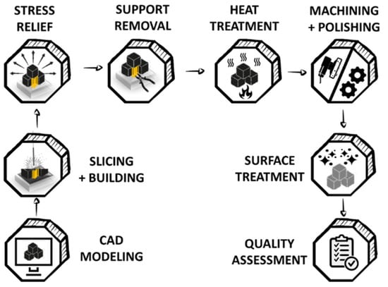 | SLM | SLM involves a high-powered laser that fully melts the metal powder particles and welds them together by melting, giving rise to more robust and denser objects than metal sintering techniques. The powder is heated to a temperature above the metal’s melting point for binding metal particles in a molten state. This rapid heating and cooling process gives rise to a broader temperature gradient, resulting in stress and dislocation in the final product, compromising the product’s mechanical properties. As powder flowability plays a vital role in SLM, only optimized metals are currently being fabricated, such as stainless steel, titanium alloys, chromium cobalt, and aluminum [46,147,148,149]. |