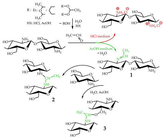 Taking into account that the reaction of nucleophilic addition and the elimination of amines to the carbonyl group and the hydrolysis of acetals are catalyzed by Lewis acids [32], the reaction between chitosan and acetaldehyde diethyl acetal (ADA) was initially carried out in hydrochloric acid solution (Figure 1). However, the gelation of chitosan was not observed up to an equimolar chitosan/ADA ratio, and an elemental analysis showed that imine was not formed (Table 1). Although ADA hydrolyzes in HCl solution yielding acetaldehyde (Figure 1), protonation of the amino groups of chitosan with the strong acid levels their nucleophilicity and reduces reactivity in the addition reactions.