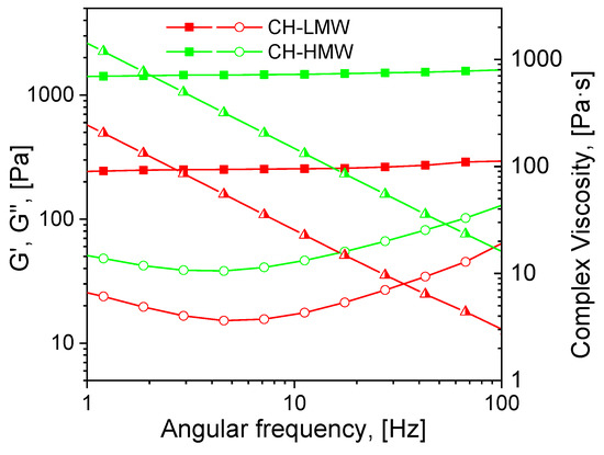 Mechanical spectra of low and high molecular weight chitosans (CH-LMW and CH-HMW, respectively) 72 h after addition of acetaldehyde diethyl acetal (ADA) at equimolar ADA:NH2 ratio. Squares—storage modulus (G′), circles—loss modulus (G″), triangles—complex viscosity.