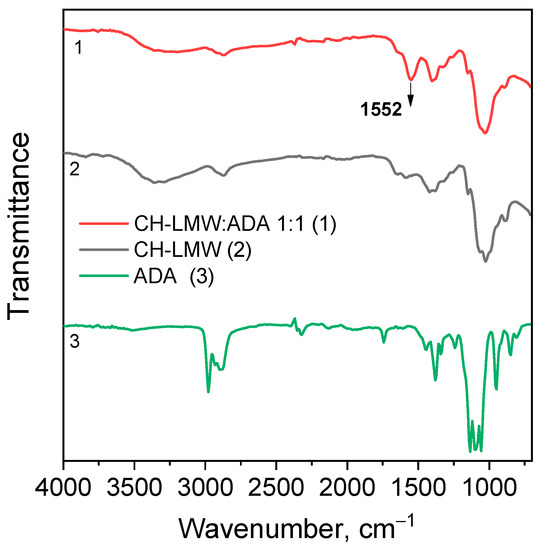 Chitosan interaction with ADA was proved by the emergence of a new imine band at 1552 cm−1 in the FT-IR spectrum (Figure 3). In the 13C NMR spectrum (Figure 4), the corresponding signals of the imino carbon atom at 168 ppm and methyl group at 18 ppm were observed but with low intensity. Taking into account elemental analysis data and calculated DM values, we assumed that the formed aliphatic imine (Structure 1 in Figure 1) was more reactive than aromatic salicylimine [28] and underwent further conversion via the reaction of nucleophilic addition with non-functionalized amino groups, as was observed for the reaction between chitosan and formaldehyde [24], or with hydroxyl groups [34].