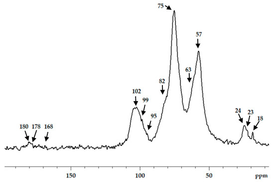 13C CP/MAS NMR spectra of chitosan cross-linked with acetaldehyde diethyl acetal (ADA) at molar ratio 1:1.