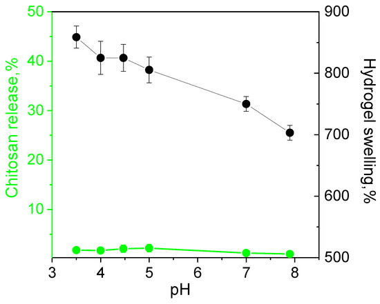 The release of the polymer from the hydrogel fabricated at equimolar ratios of ADA with chitosan in pH range from 3 to 8 was below 1% indicating irreversibility of the cross-linking and high hydrolytic stability of the material even in acidic media. The swelling degree decreased slowly with the pH increase due to the lower protonation degree of chitosan (Figure 6).