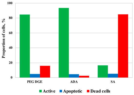 Although a relatively high concentration of ADA was required for the fabrication of the mechanically stable hydrogels, Figure 7 demonstrates that ADA cytotoxicity was comparable with that of diglycidyl ether of polyethyleneglycol (PEG DGE), which is known as a highly biocompatible cross-linker [39,40], and was remarkably lower in comparison with salicylaldehyde (SA), selected as an example of monoaldehyde applicable for chitosan-based hydrogel fabrication [26,28]. Incubation of HCT116 cells for 3.5 h with cross-linkers at concentrations suitable for the fabrication of the hydrogels resulted in a slight decrease in mitochondrial activity to 85–93% (in the case of PEG DGE and ADA) and a consequent increase in the dead cell fraction. SA possessed the highest cytotoxicity leading to the death of about 85% of cells. The level of apoptosis remained almost unchanged in all tests indicating that cell death could result from an increase in cellular membrane permeability by cross-linkers.