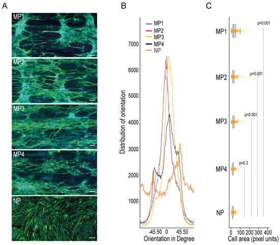 Impact of 3D-PMMD on cells orientation and morphology. (A) Cells were grown in microfluidic devices with different micropatterns as well as in conventional flat dishes. After the differentiation induction, cells were stained with F-actin for the analysis of cells orientation and morphology; green, F-actin; blue, DAPI; scale bar of 100 µm. (B) Representative histograms of cell orientation measurement at different dimensions; 100 µm (MP1), 200 µm (MP2), 400 µm (MP4), and none patterned conventional dishes (NP); distribution of orientation indicates the counts of pixel of objects based on their structure tensor. (C) Box plot showing the single-cell morphology analysis of cells area measurement in 3D-PMMD versus cells in conventional culturing dishes; box limits indicate the 25th and 75th percentiles. Each sample contains 1100 cells of a total random sample number of four. P values were obtained by Tukey’s HSD comparison test.
