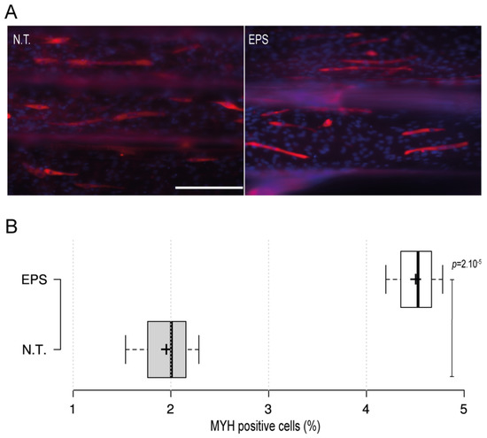 The impact of the electrical pulse stimuli (EPS) on myotubes differentiation. On day four after the initiation of the differentiation, cells were exposed to EPS for 3 h, cultured for 24 h, and then immunofluorescence staining of the myogenic MYH was conducted. (A) Fluorescence microscopy images of MYH expression in cells under no treatment conditions (N.T.) and EPS conditions. Red: MHY, Blue: DAPI; Scale bar of 200 µm. (B) Box plot showing MYH positive cells populations in 3D-PMMD under N.T and EPS conditions; box limits indicate the 25th and 75th; (n = 4). p values were obtained by unpaired t test.