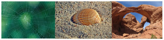 Left: spider web (photo by www.patternpictures.com; last accessed 2 December 2021); center: mollusk shell (photo by www.pixabay.com; last accessed 2 December 2021); right: Double O Arch in Utah’s Arches National Park: 22 m long sandstone arches (photo by Ken Lund).