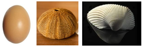 There are many examples of shells in nature (Figure 2): eggshells, seashells, turtles, skulls, nuts, etc. [8]. Shells and exoskeletons protect the inner organs of sea urchins, snails, mussels, insects, and many other animals against predators and other potential dangers [12]. These natural forms have served as a source of inspiration for many architects and engineers throughout history. In particular, the unique characteristics of these constructions created by chickens, clams, scallops, and other mollusks can be considered as the origin of the construction of reinforced concrete shells.