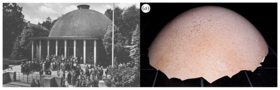 Left: Zeiss Planetarium in Jena, Germany, by Franz Dischinguer, 1926, (picture by Karl Müller, 1926). Right: intact egg cap resulting from distributed load experiment [12].
